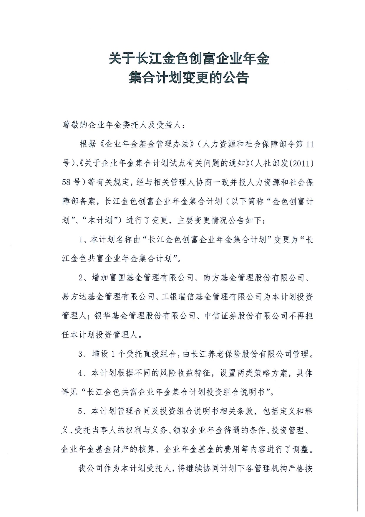 關(guān)于長江金色創(chuàng)富企業(yè)年金集合計劃變更的公告(2021年12月)